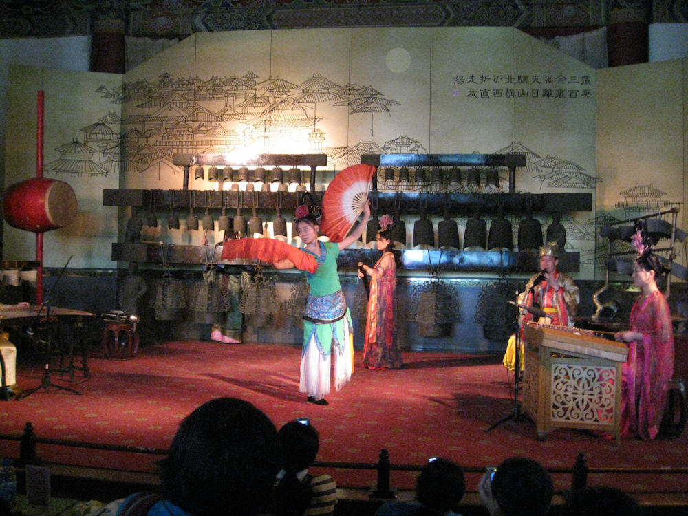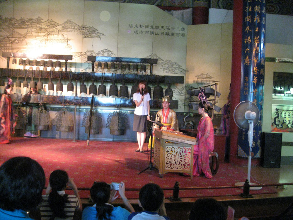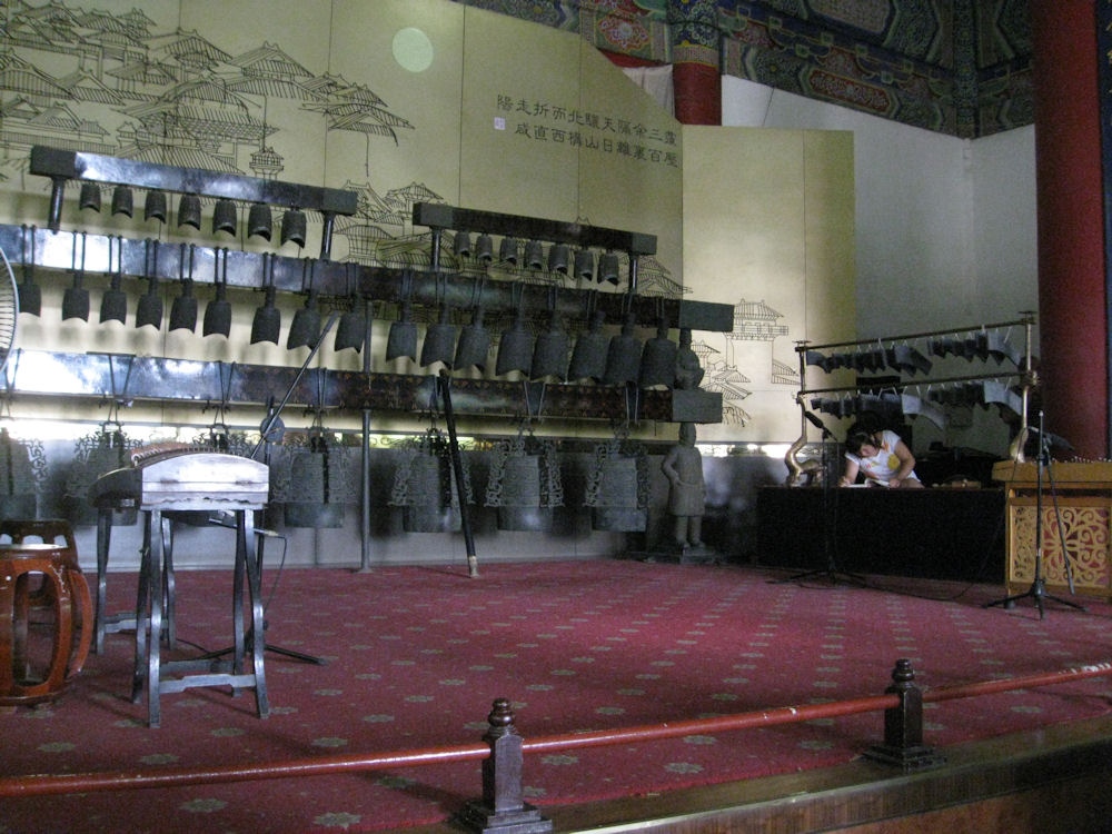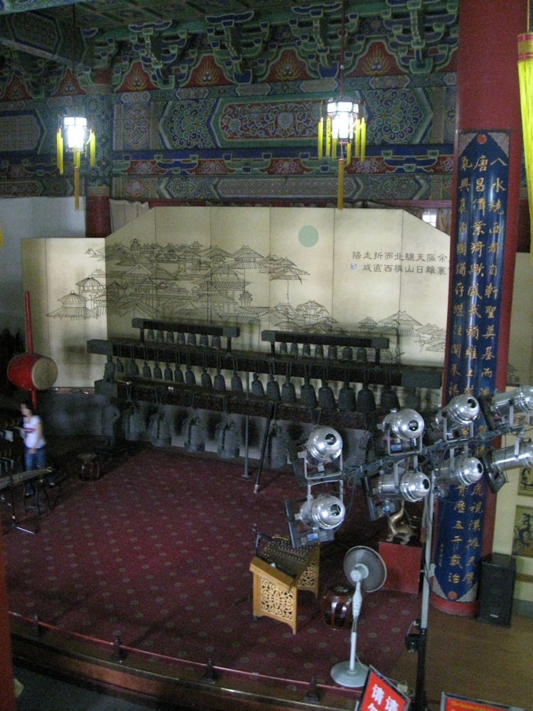 large bronze-cast bells from the Tang Dynasty. The tower base is square
